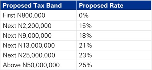 Section 58 of the Act introduces a tax-exempt threshold of N800,000 and increases tax rates for high income earners. The new tax rates range from 0% to 25%. The Fourth Schedule of the Act, reproduced in the table below, shows the tax bands and rates: